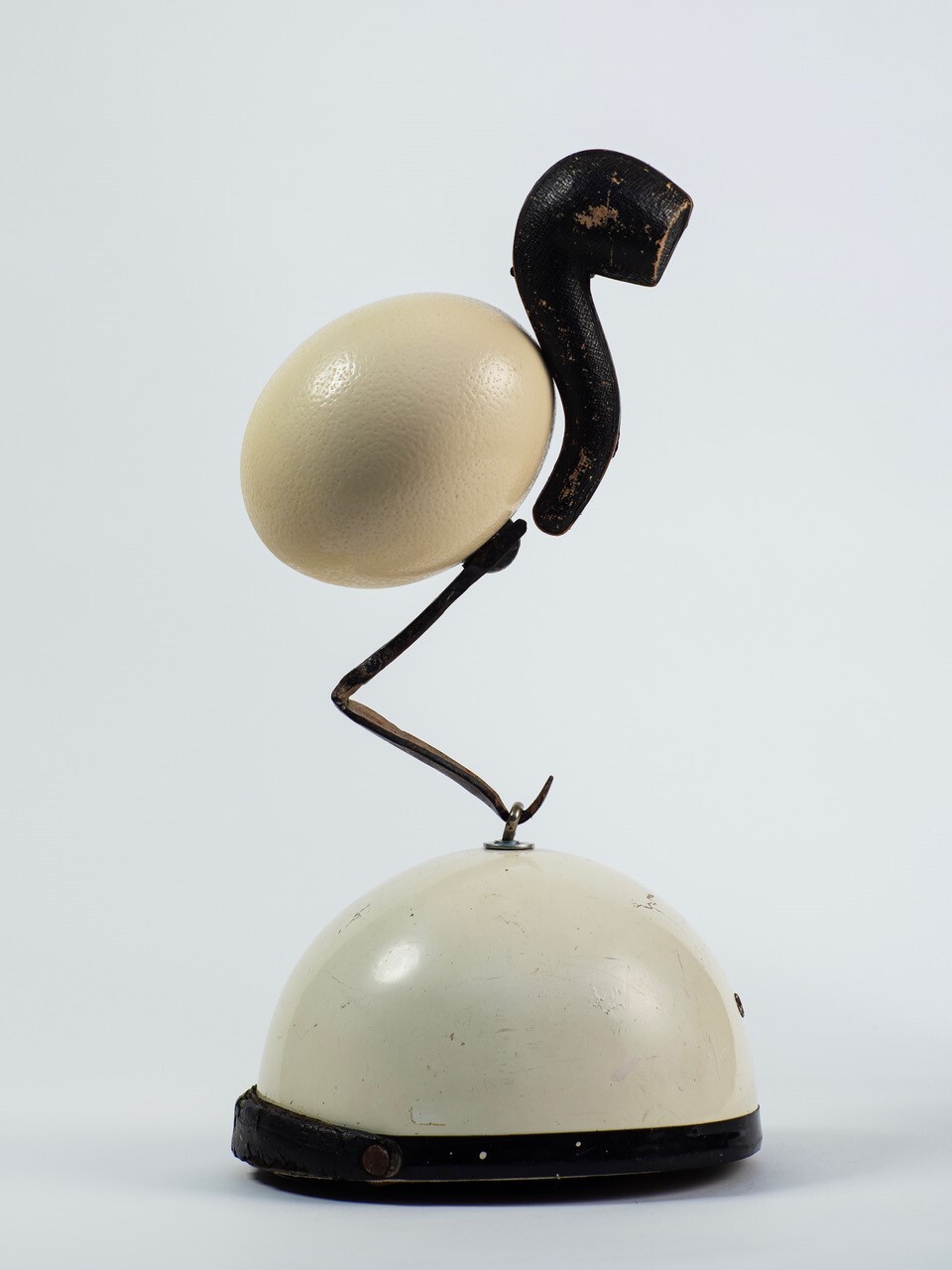 Gijs Assmann, ‘Dummy (II)’, 2024, 28 × 22 × 43 cm, Struisvogelei, pijpenetui, brommerhelm, staal,