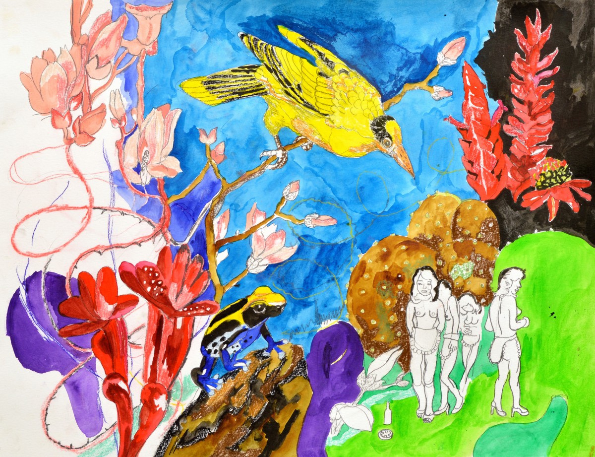 Charlotte Schleiffert, Yellow Bird and Frog, mixed techniques on paper, 50 x 65 cm, 2018