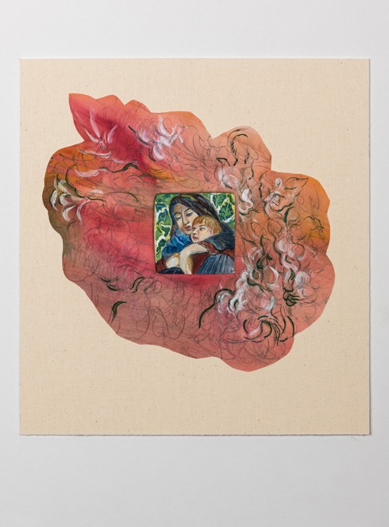 Kalliopi Lemos, The Feminine and Nature #1, 2023, thick board covered with cotton textile, cut-outs from paintings with acrylic on cotton and collaged on the board, framing small paintings with watercolor and gouache, 43 cm x 40 cm.