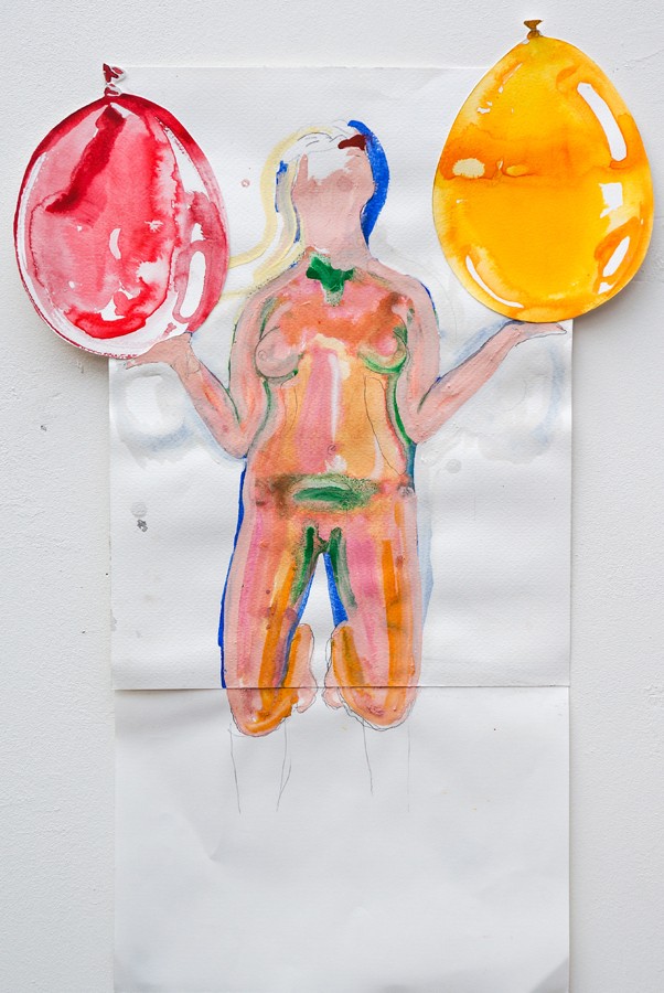 Gijs Assmann juggles with materials and stories. He seduces the senses with images of blown glass and glazed ceramics. Together with watercolours in flowing colours, they stir up a flow of associations. Human figures in acrobatic poses play a leading role. They stretch out on paper and in the space around them, make a dance move or form a stage for each other: a man curves his body into an arch of desire; a woman towers over him.