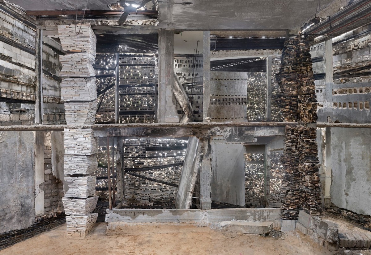 This art is extreme – the size and scale, but also the physical, psychological, and social scope. It’s as if Teeuwen explores the building’s memory. Houses which once gave homes to countless different lives are taken inside out. All the wood, stone, concrete, plaster, and other sheet metal is sawn or beaten into pieces, insofar as it hasn’t already been destroyed by violence.