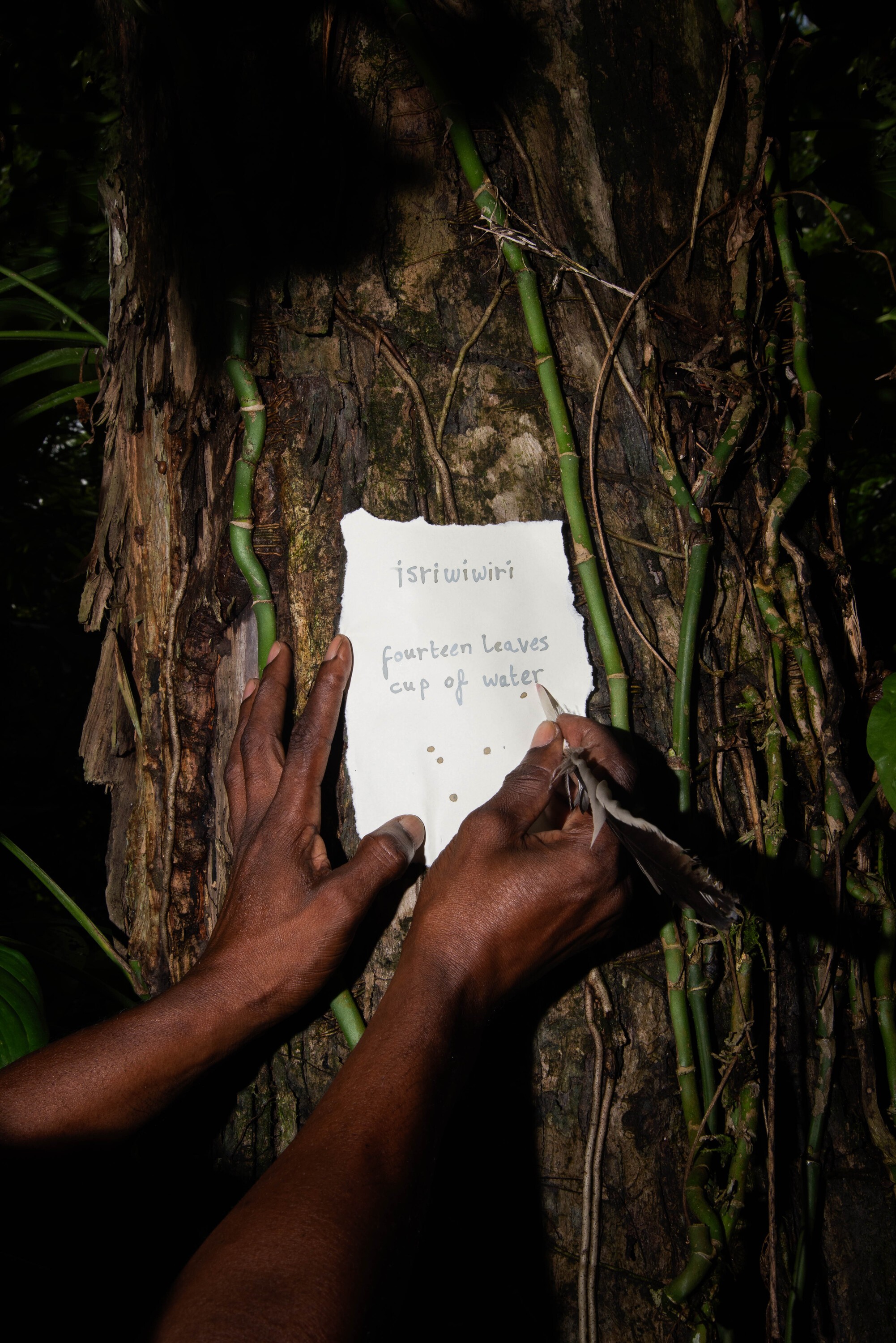 ‘Fourteen leaves and a cup of water’ is het volgende hoofdstuk in de reeks. Het gaat over de uitgebreide kennis van flora van de tot slaafgemaakten. Verworven uit eigen ondervindingen en hun gedetailleerde herinneringen aan de Afrikaanse wouden en savanne. Door deze kennis in te zetten als machtsmiddel, wisten sommige van hen hun onderdrukkers te vergiftigen. Ze kenden de medicinale werking van bepaalde bladeren en wisten welke planten eetbaar waren en welke niet. Het is deze diepgewortelde plantenkennis die hen in staat heeft gesteld te ontsnappen aan de wrede omstandigheden op de plantage en te overleven in het dicht beboste regenwoud van Suriname