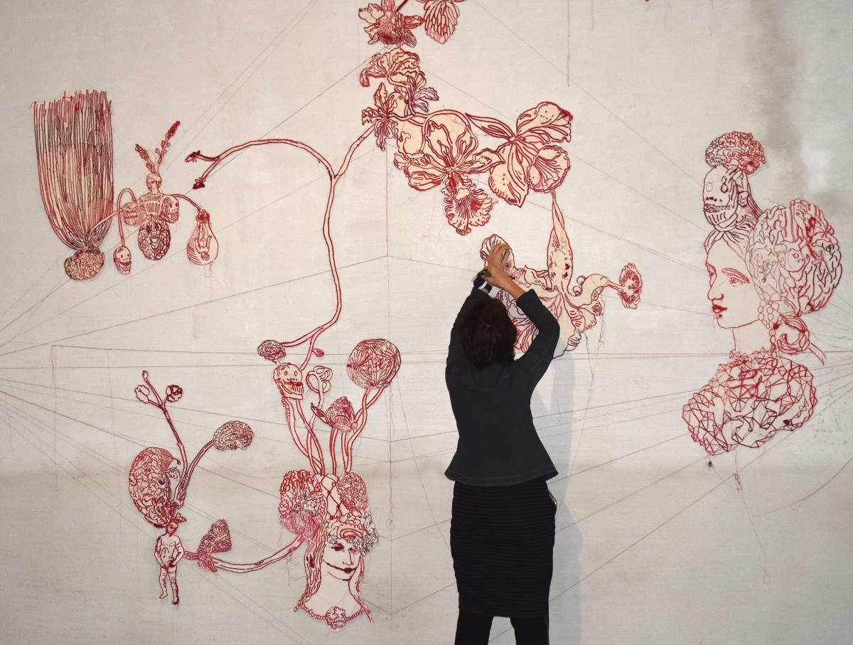 The signature of Seet van Hout (Nijmegen, 1957) has the elegance of blood coral. Her work consists of paintings, sculptures, and installations, in which the colour red plays a leading role. The sweeping contours are also characteristic. Her creations show many fanning lines and lace-like patterns, which make this oeuvre a tight fabric, full of branches and connections. There is literally a thread running through it. The embroidery machine is this artist’s right hand.