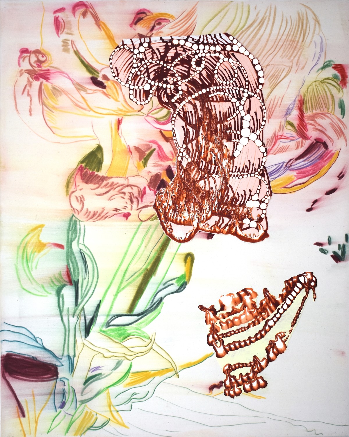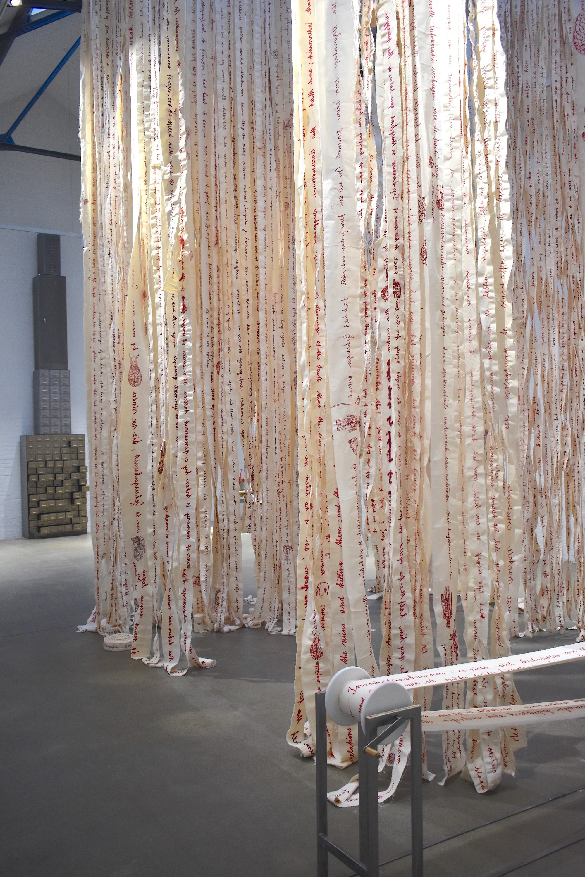 Van Hout sets out traces with her running thread. She unfolds a wondrous floor plan on canvas, paper and in space, with strips of textile that curl over the floor or hang from the ceiling. Flowing lines stretch like footpaths in a garden. They grow into stems of flowers and plants, a girl's face wreathed in ringlets. At the same time, they mirror our vascular system and the curved areas in the brain, the intestines, and our own inner selves. What goes on in the head and the heart?
