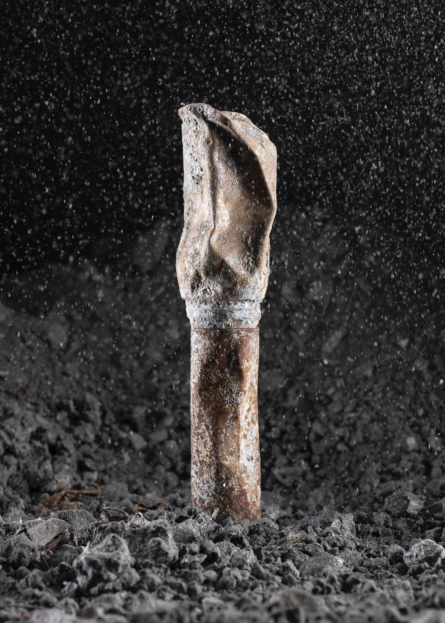 He makes a broad selection at first, extracting objects that have resisted the combustion. In the course of his expeditions, he becomes more selective and thus completes his collection of shapes. Placed in hermetically sealed tons, he brings the objects to his workshop to take portraits of them. It’s a mini studio he has set-up on site: A space is defined, a kind of small theatre with a black background and lighting from both sides. The artist chooses a minimalistic staging, relying exclusively on lighting effects without any other accessories or artifice. His approach is a simple visual syntax for objects that are themselves shown in their simplest form. Through these few determined elements – light, shades of grey, solid shapes – he creates chiselled images. In these almost monochrome landscapes, the rust contrasts. Ochre, red, orange, pale, intense… alive… it unfolds the effect of nuanced carnations on these shapes.