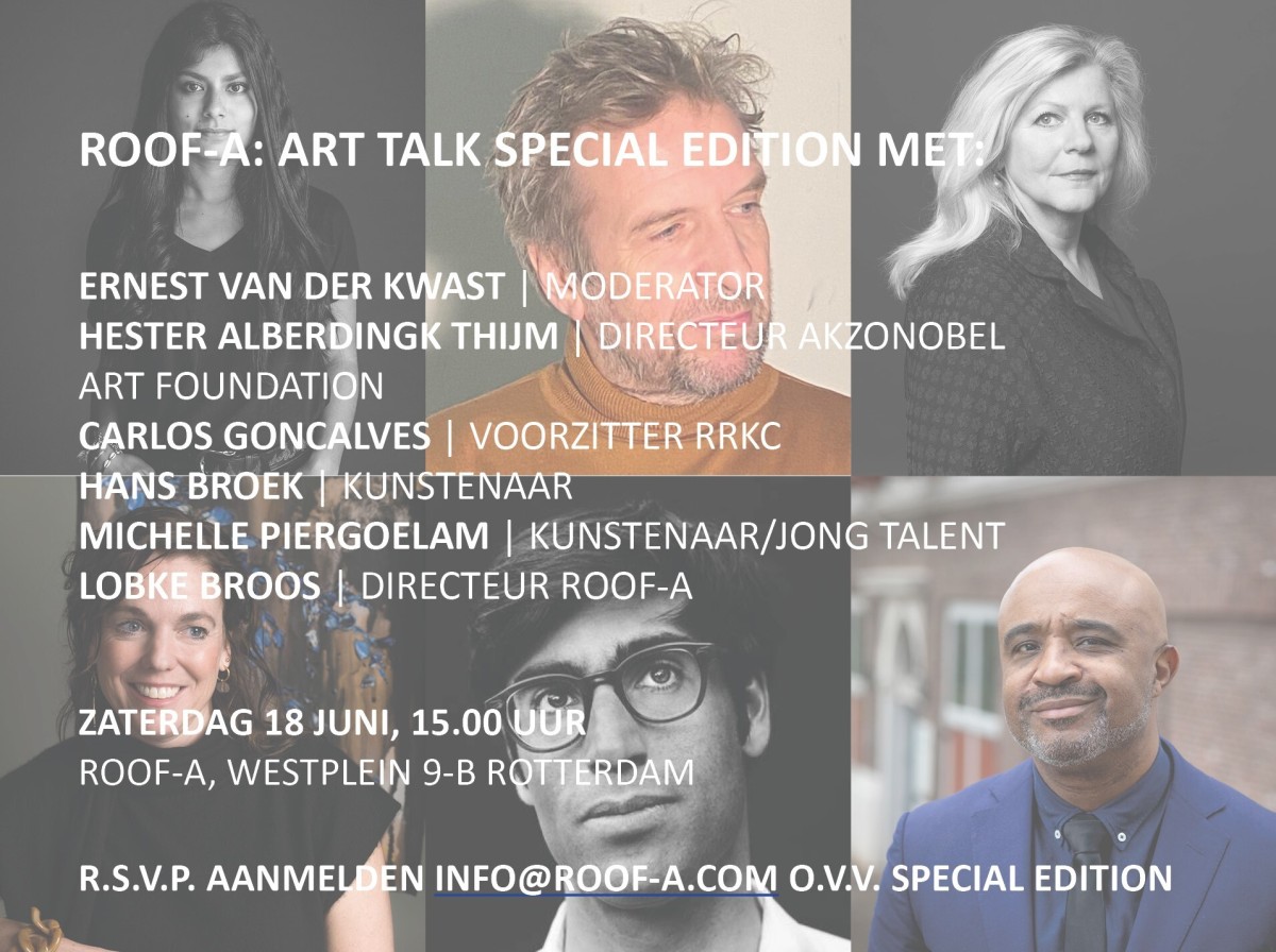 Samen met onze kick-off partner de AkzoNobel Art Foundation nodigen wij u graag uit voor de ROOF-A: Art Talk Special Edition met Ernest van der Kwast (moderator), Hester Alberdingk Thijm (Directeur AkzoNobel Art Foundation), Carlos Goncalves (Voorzitter RRKC), Hans Broek (kunstenaar), Michelle Piergoelam (kunstenaar/jong talent), Lobke Broos (directeur ROOF-A).