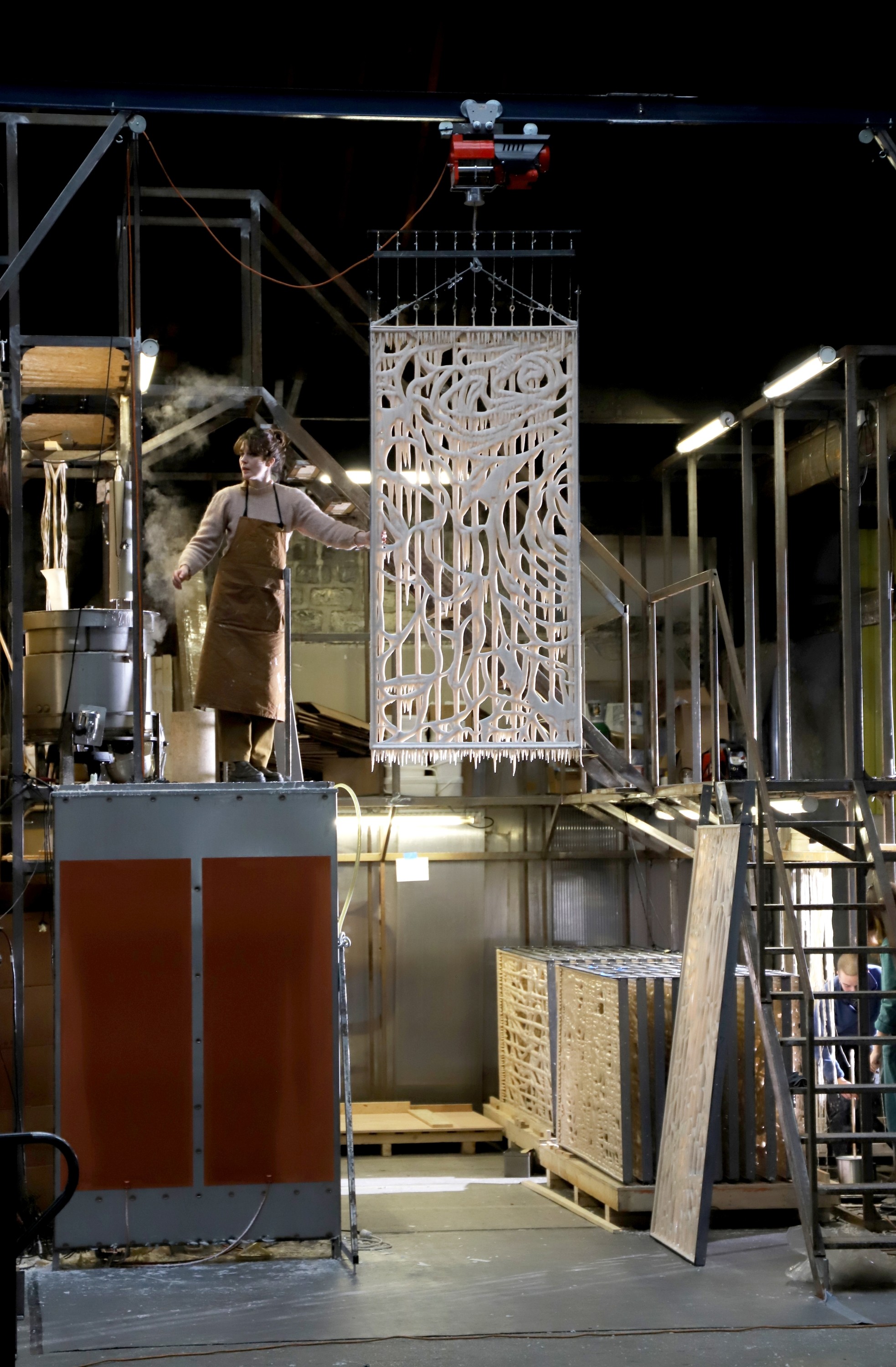 The exhibition 'Passages' at ROOF-A is described by Minchin as ‘an imaginary sanctuary.’ This sanctuary contains twenty-four sculptures partly covered in wax. Each sculpture has openings to allow the wind to pass through. In addition to the sculptures, she presents seven drawings called Hydromancies, two of which are enormous and hang from the ceiling on the gallery's first floor. Like her sculptures, the drawings are about transformation and a cyclical, rather than linear, time. The wax she uses and reuses, as Minchin writes, is "like a soul passing into another soul."