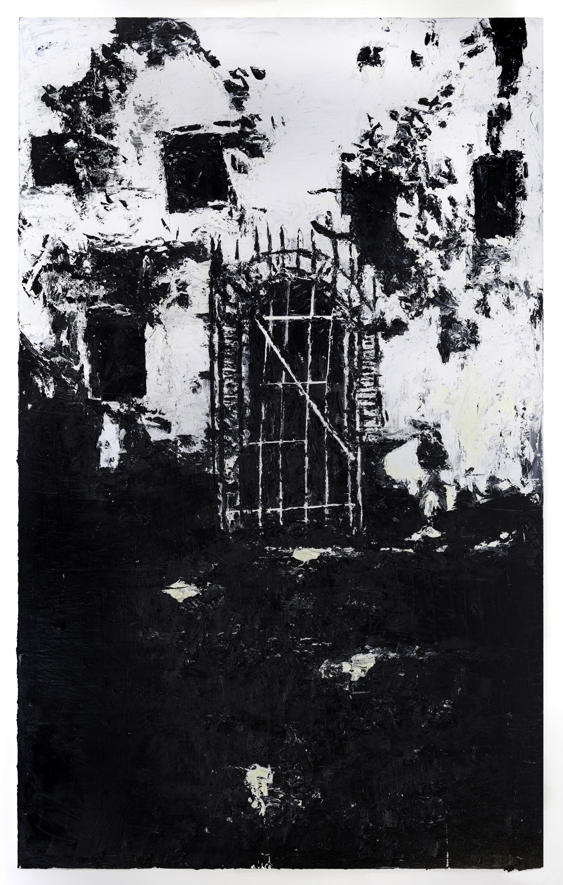 Hans Broek (Veenendaal, 1965) paints as if he were laying bricks with palette knives dipped in pitch. Slave forts, slave dungeons, plantation complexes in Africa and Surinam. Many buildings are still standing today. Guilty architecture, sometimes overgrown by nature. He travelled and worked on site, in Senegal, Ghana and Surinam. He remarks that the architectural typology of slavery’s past was “a gruesome eye opener … with a power structure that the Nazis learned from.” As a painter, he calms his bewilderment through his work.