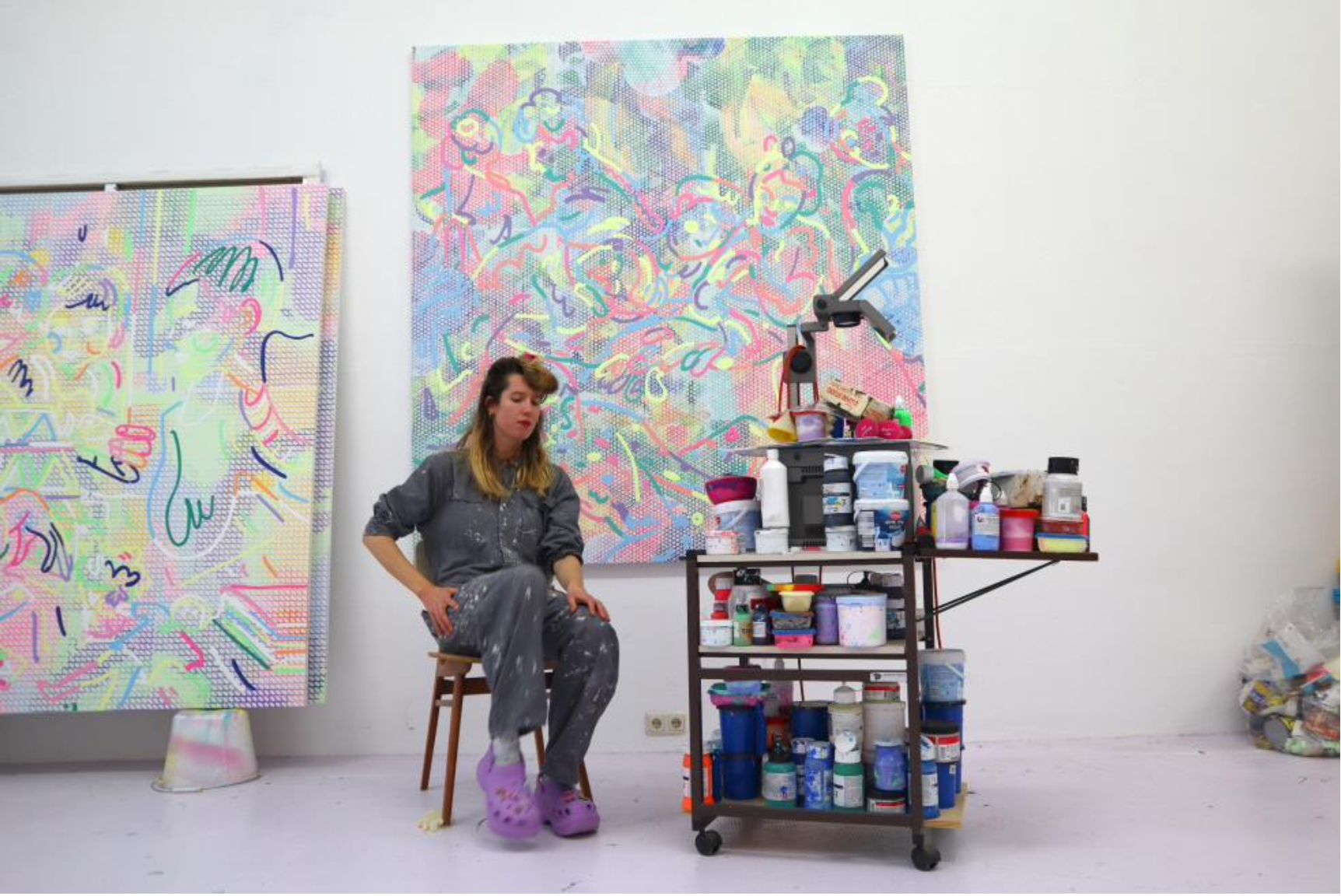 It immediately becomes clear: Vera Gulikers’ work plays with making a first impression. Both the sculptures and the paintings are large. They use colours that recall candy shops and young girls’ bedrooms: pastel green, yellow, and pink. The sculptures are imposing and cheerfully coloured, exuberant and playful. The first impression is disconcerting, all those large surfaces with sweet colours and confusing grids, the quirky, squiggly lines. That first impression is a kind of test, a challenge. You’re asked to dance, but you don't know the steps yet. It’s best to let your dance partner lead you. If you accept and move with the flow, you gain access to an intelligent and sometimes puzzling world. Vera Gulikers cheerfully bangs her fist on the table and after that, her rules of the game are the only ones that count.