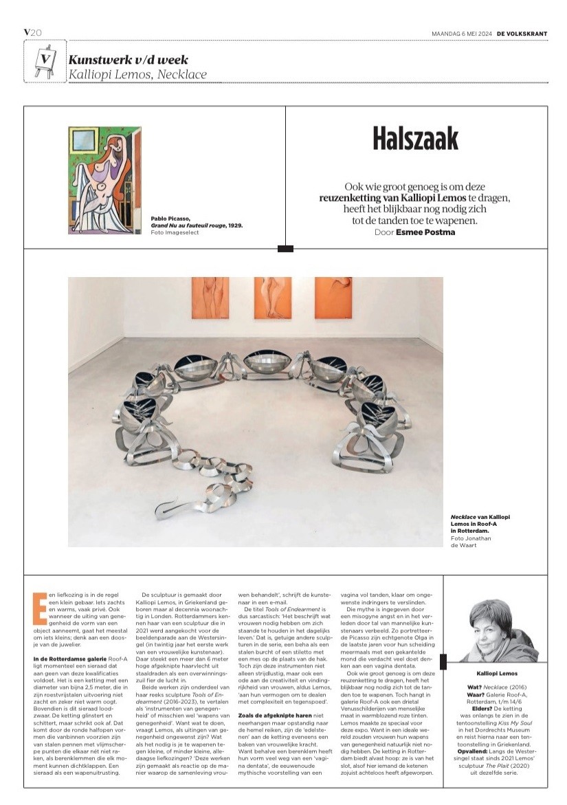 In de Rotterdamse galerie Roof-A ligt momenteel een sieraad dat aan geen van deze kwalificaties voldoet. Het is een ketting met een diameter van bijna tweeëneenhalve meter, die in zijn roestvrijstalen uitvoering niet zacht en zeker niet warm oogt. Bovendien is dit sieraad loodzwaar. De ketting glinstert en schittert, maar schrikt ook af. Dat komt door de ronde halfopen vormen die van binnen voorzien zijn van stalen pennen met vlijmscherpe punten die elkaar nét niet raken, als berenklemmen die elk moment dicht kunnen klappen. Een sieraad als een wapenuitrusting.