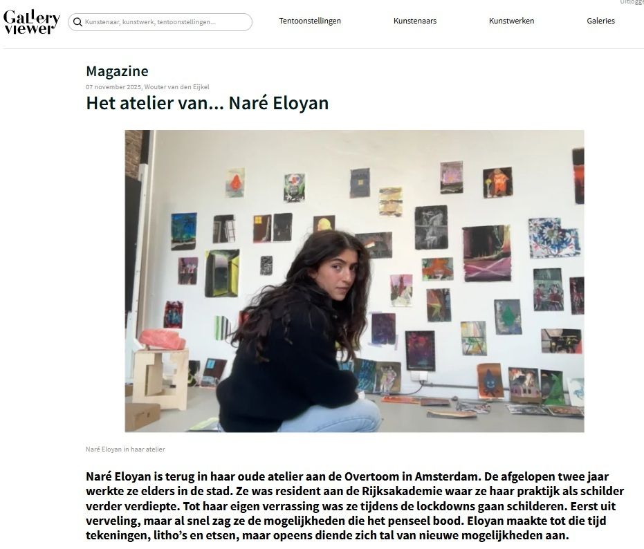 Naré Eloyan is terug in haar oude atelier aan de Overtoom in Amsterdam. De afgelopen twee jaar werkte ze elders in de stad. Ze was resident aan de Rijksakademie waar ze haar praktijk als schilder verder verdiepte. Tot haar eigen verrassing was ze tijdens de lockdowns gaan schilderen. Eerst uit verveling, maar al snel zag ze de mogelijkheden die het penseel bood. Eloyan maakte tot die tijd tekeningen, litho’s en etsen, maar opeens diende zich tal van nieuwe mogelijkheden aan.