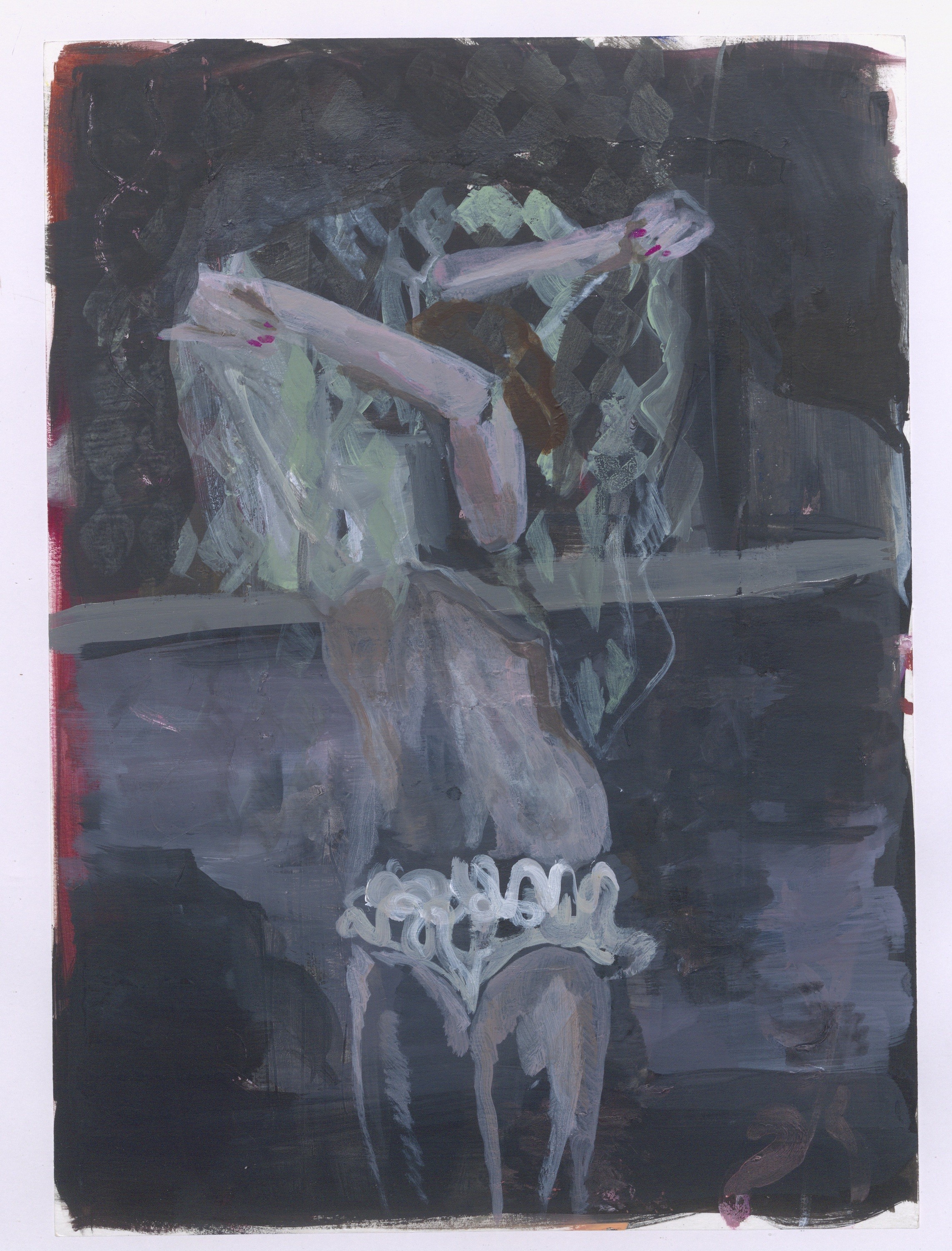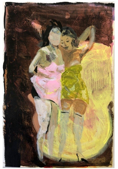 Je wordt geciteerd in het persbericht: "Met deze schilderijen heb ik geprobeerd de vloeiendheid en verrassing van beeldverbindingen vast te leggen”. Zou je dat aan de hand van het werk Pauline B. of Ladies of the Evening kunnen toelichten?