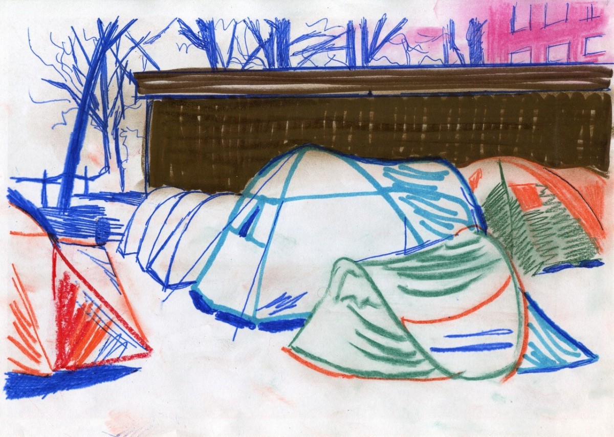 Hester Oerlemans, Homeless Camp, 2025, 30 x 21 cm, (framed 40 x 30 cm), Ink, coloured pencil on paper