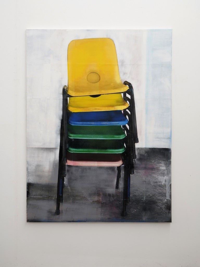 Hester Oerlemans, Xiamen chairs, 2022, 120 x 160 cm. Spray paint, laser prints on canvas