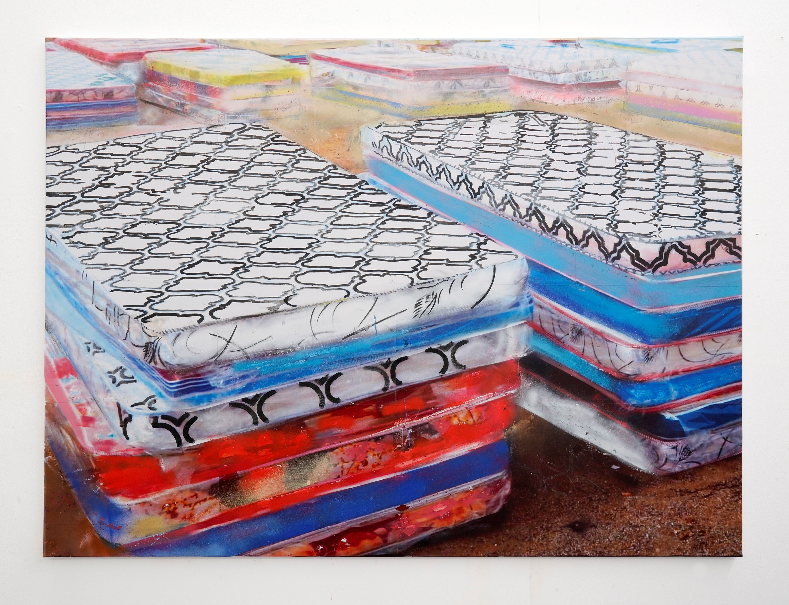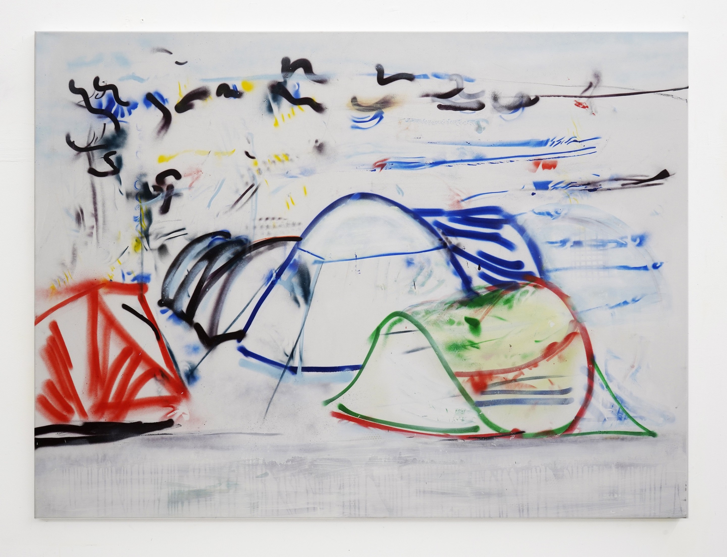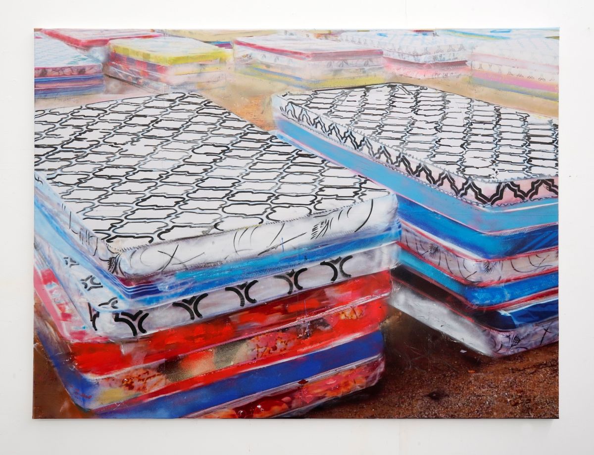 Hester Oerlemans, Homeless Camp, 2025, 160 x 120 cm, laserprints, spraypaint, acrylverf op canvas
