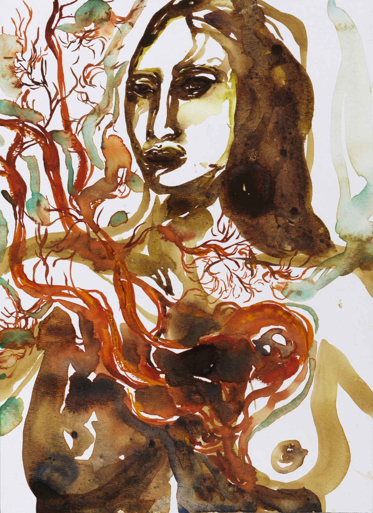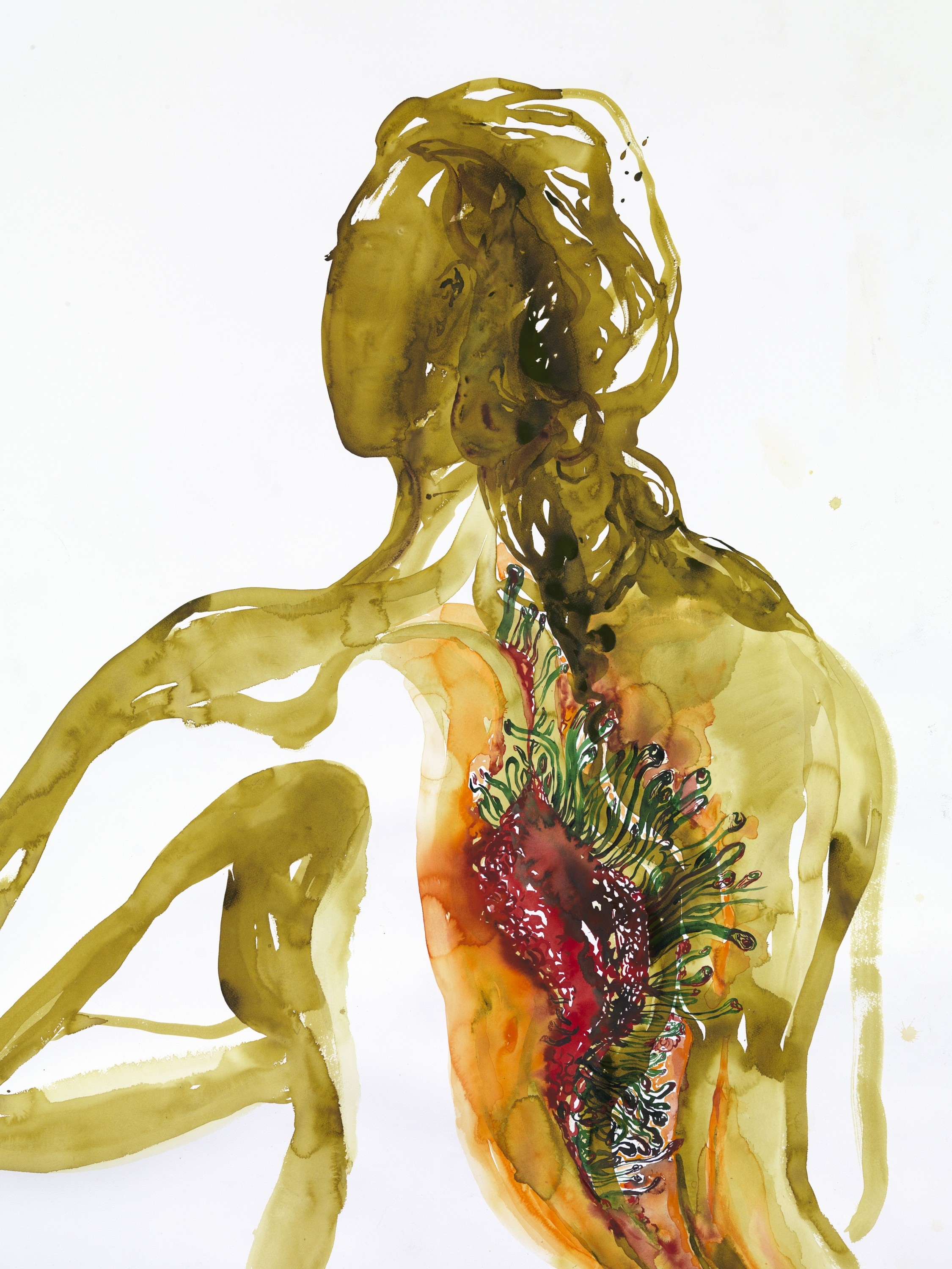 Op de vaak monumentale aquarellen die Aline Thomassen (Maastricht, 1964) al sinds het eind van de jaren negentig maakt, staan vrouwen. Ze zijn bijna altijd naakt, hun heupen zijn breed, soms houden ze een (groot) kind in hun armen, soms zweven er een heleboel kinderen om ze heen. Als een sprookje, een wens, een blik in de toekomst misschien: zoveel kleintjes zijn er mogelijk. Soms zijn de lichamen bedekt met fijn kalligrafisch schrift of wonderlijke zuignapjes die vanuit een rug de ruimte in groeien en lijken te wiegen op de wind. Thomassens vrouwen hebben iets raadselachtigs, ondanks hun grote postuur.