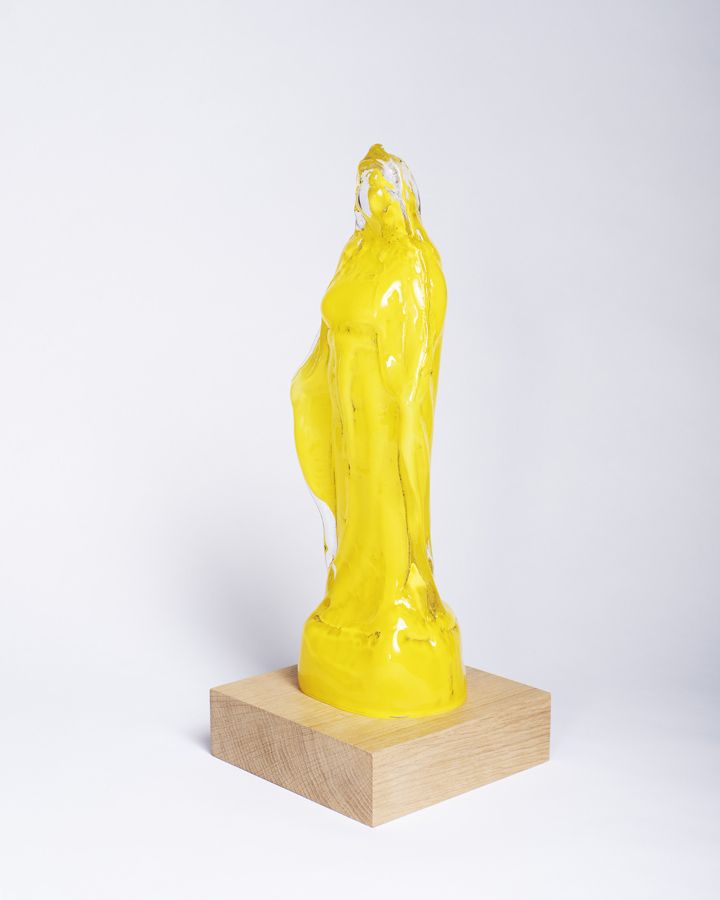 Elders heft een vrouw twee ballonnen op, alsof zij haar geluk weegt. Zelf doemt ze op als een blonde wolk op het witte papier; bijna een visioen waarvan je vreest dat het uiteendrijft of kapot spat zodra je wegkijkt. Zo brengt Assmann op zijn tentoonstelling ‘Foreshadowing’ ontmoetingen tot stand tussen het mystieke en alledaagse. Hij laat Madonnabeelden zien met vloeiende contouren van spiegelglas. Zijn werk is vervuld van sensualiteit en symboliek: een glimp van het paradijs, maar ook een pijnlijk besef van tijdelijkheid.