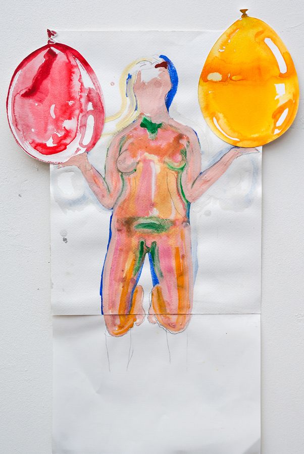 Menselijke figuren in acrobatische poses spelen een hoofdrol. Ze strekken zich uit op papier en in de ruimte, maken een danspas of vormen een podium voor elkaar: een man welft zijn lichaam tot een boog van verlangen; een vrouw torent hoog op hem.