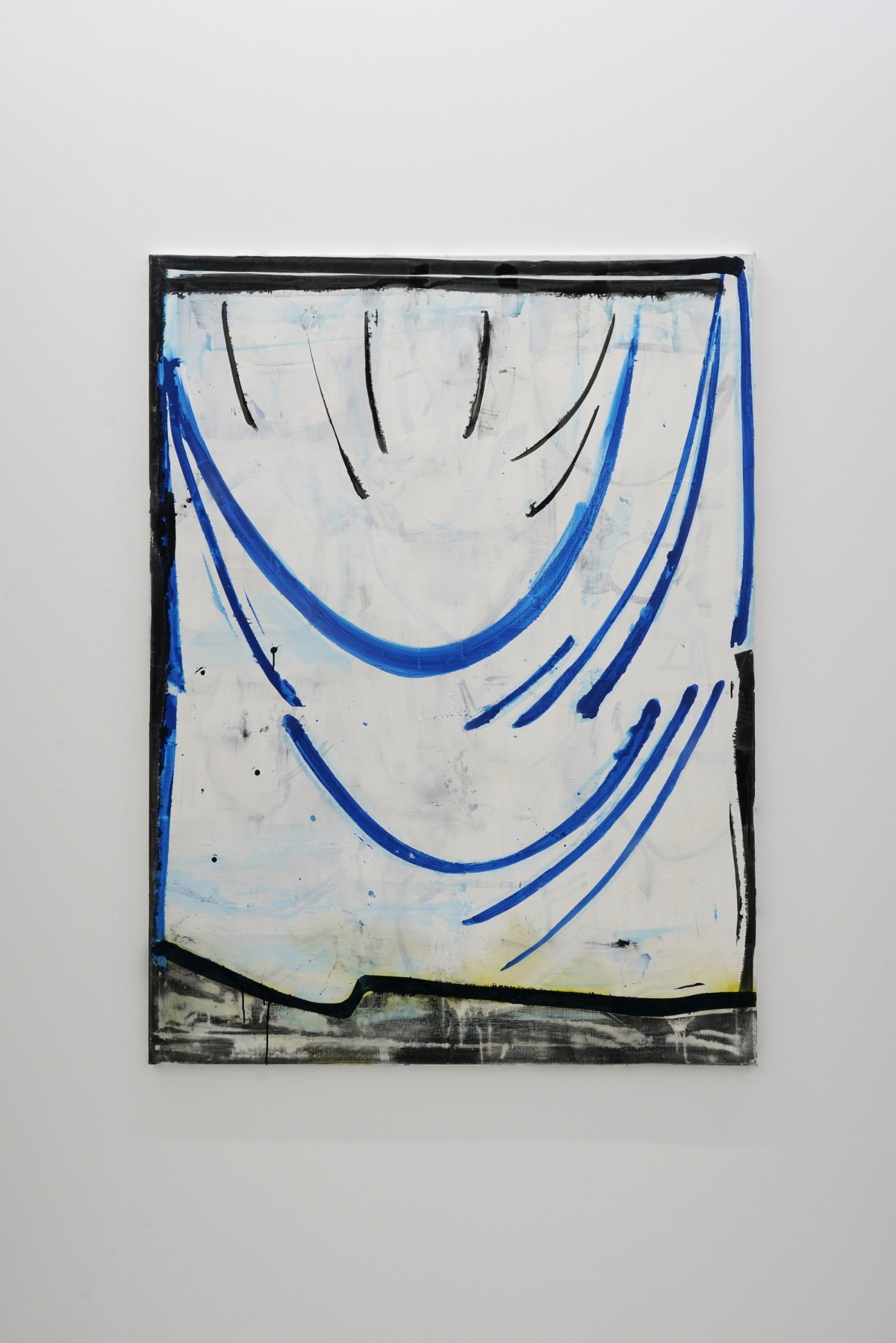 Het zijn deze foto’s die Hester Oerlemans inspireerden tot een zesdelige serie schilderijen met de gezamenlijke titel Sniper Curtains (2019-2021). De voorstelling is teruggebracht tot enkele lijnen die de omtrek en de plooien van de gordijnen aanduiden, soms in zwart, meestal in heldere tinten blauw, geel, groen, of oranje. Het resultaat is een simpel, sterk beeld met de kracht van een icoon. De lijnen zijn als die in cartoons: bewegelijk, efficiënt, expressief, doeltreffend. Dat het hangende doek vrijwel geheel samenvalt met het beeldvlak van het schilderij heeft iets paradoxaals.