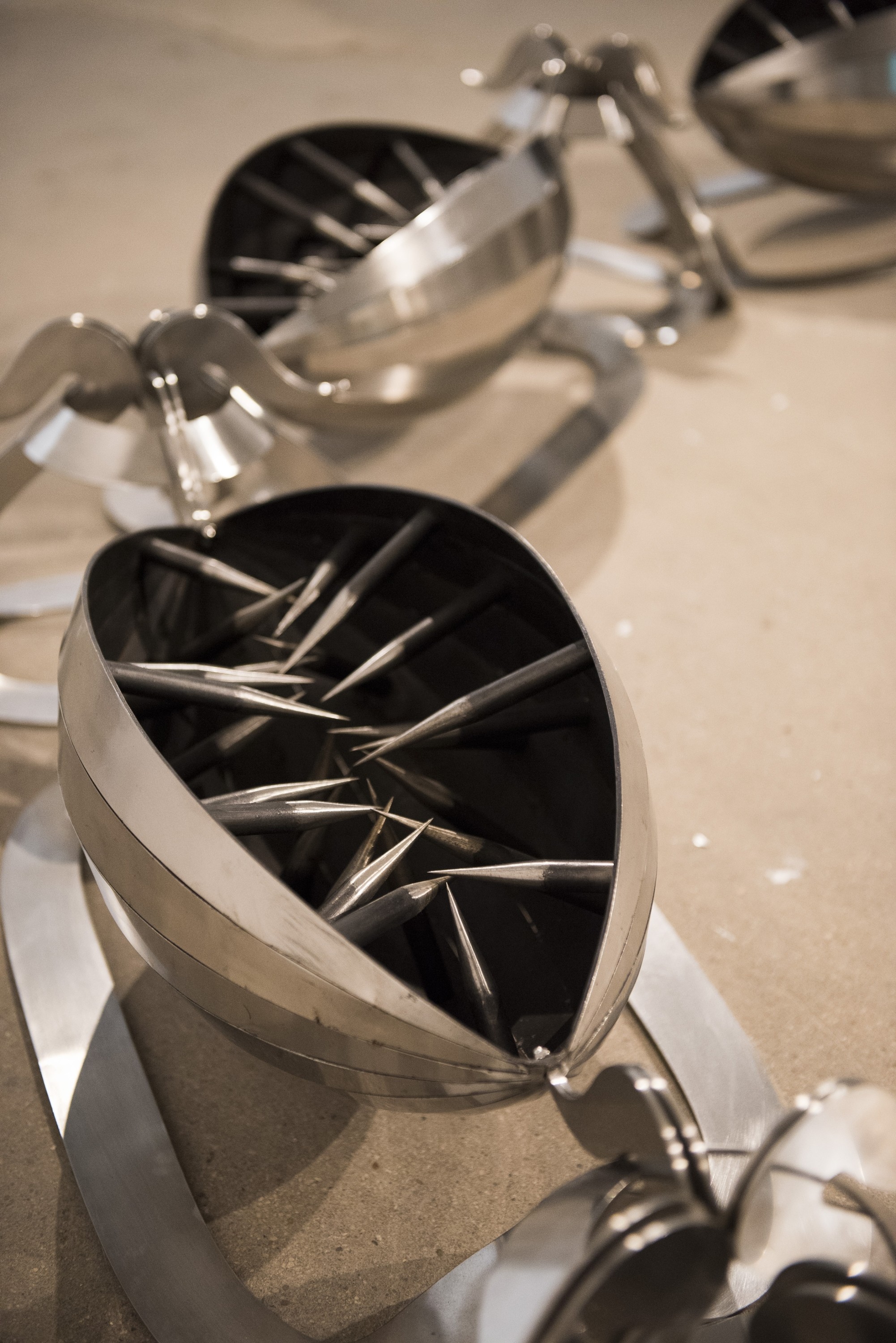 Het beeld maakt deel uit van een grote groep sculpturen, vaak in de openbare ruimte, die Lemos tussen 2016 en 2023 heeft gemaakt. Die groep heet Tools of Endearment, te vertalen als: handvaten van genegenheid. Zo’n ‘handvat van genegenheid’ kan een gigantische stalen korset zijn, een enorme stilettohak met op de plaats van een hak een mes, of een ketting voor om je hals. Die ketting – ‘Necklace’ (2016) geheten – ligt nu op de galerievloer bij Roof-A in Rotterdam. De ketting is van roestvrij staal, blinkt en lonkt, maar schrikt ook af. De ketting is loodzwaar, de onderdelen lijken op berenklemmen en een draagster zou gegarandeerd verwond raken door de scherpe randen van dit juweel. In haar Tools of Endearment legt Lemos de vinger op de zere plek. De beelden, zo schrijft ze me, drukken uit dat vrouwen in onze samenleving “creatieve wezens zijn, complex en tegenstrijdig”. Die tegenstrijdigheid zit ook in Lemos’ beelden: de handvaten om genegenheid te tonen, zijn vlijmscherp. Maar zijn ze ook effectief? Genegenheid en liefde hangen niet af van de hoogte van onze hakken of de maat van onze beha. En de goding Venus, zo schrijft Lemos me, heeft er al helemaal nooit naar getaald.