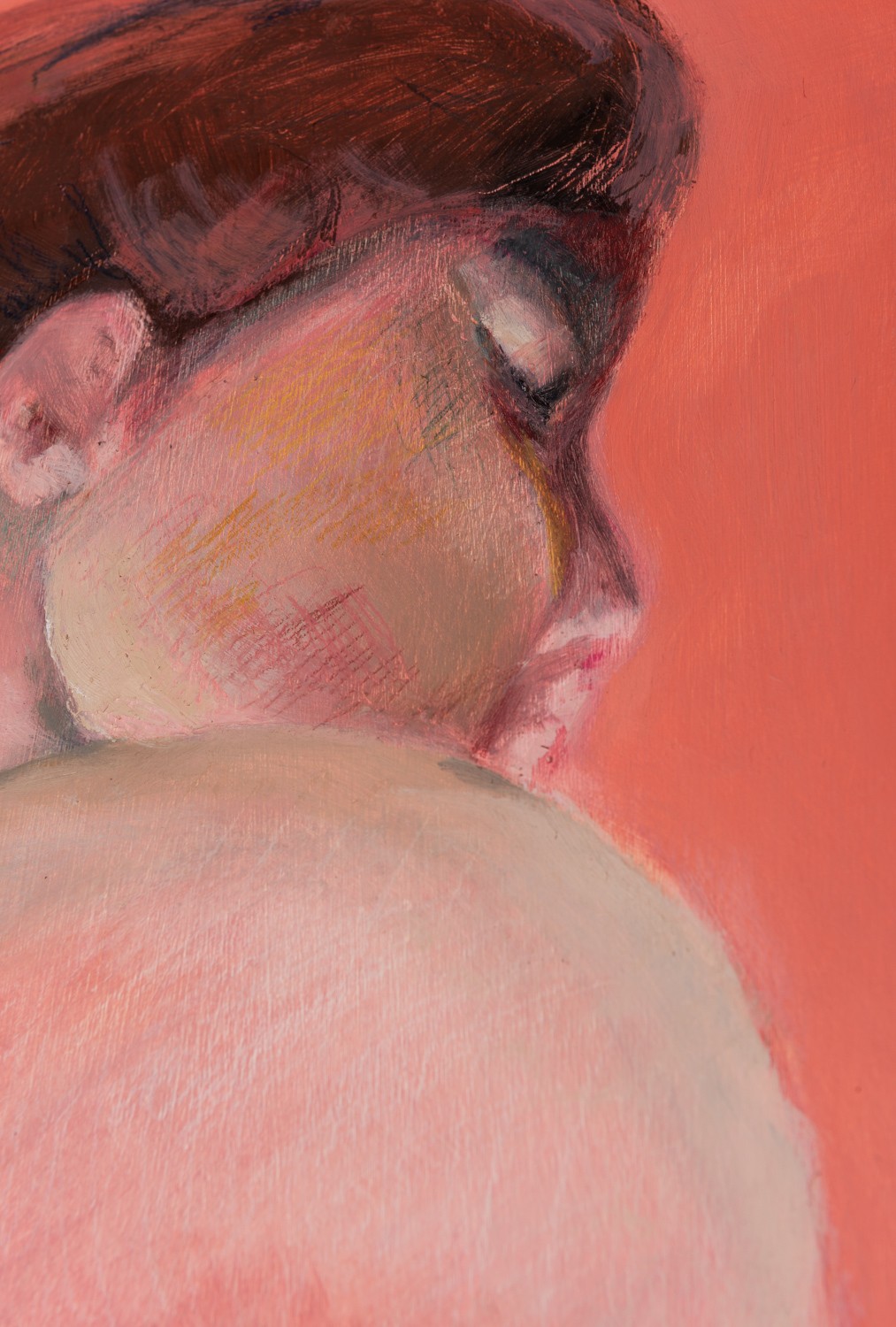 Twee sprookjesachtige olieverfschilderijen laten dit zien. Once upon a time (by the water) (2024) en Once upon a time (in the woods) (2024) stellen drie vrouwen voor. Ze zijn naakt, ze raken elkaar aan, ze zijn één in drieën, ze zijn zelfverzekerd en sereen. De drie staan tussen de eikenbomen, zitten op het gras en worden omringd door krokodillen en een slang. De natuur om de vrouwen heen is weelderig, in zachte pasteltinten geschilderd, maar ook dreigend. Het is niet duidelijk of de krokodillen een middagdutje doen, of de slang nieuwsgierig is, de vrouwen geheimen toefluistert of uit de eikenboom naar beneden afdaalt om te bijten. Ook de uit eenentwintig delen bestaande serie The Feminine and Nature (2023) onderzoekt de rol van vrouwen in de natuur. Dat onderzoek gaat laag voor laag. Je ogen dalen af in het beeld. Elk deel van de serie bestaat uit een los geschilderd portret van vrouwen van verschillende leeftijden en uit verschillende culturen.