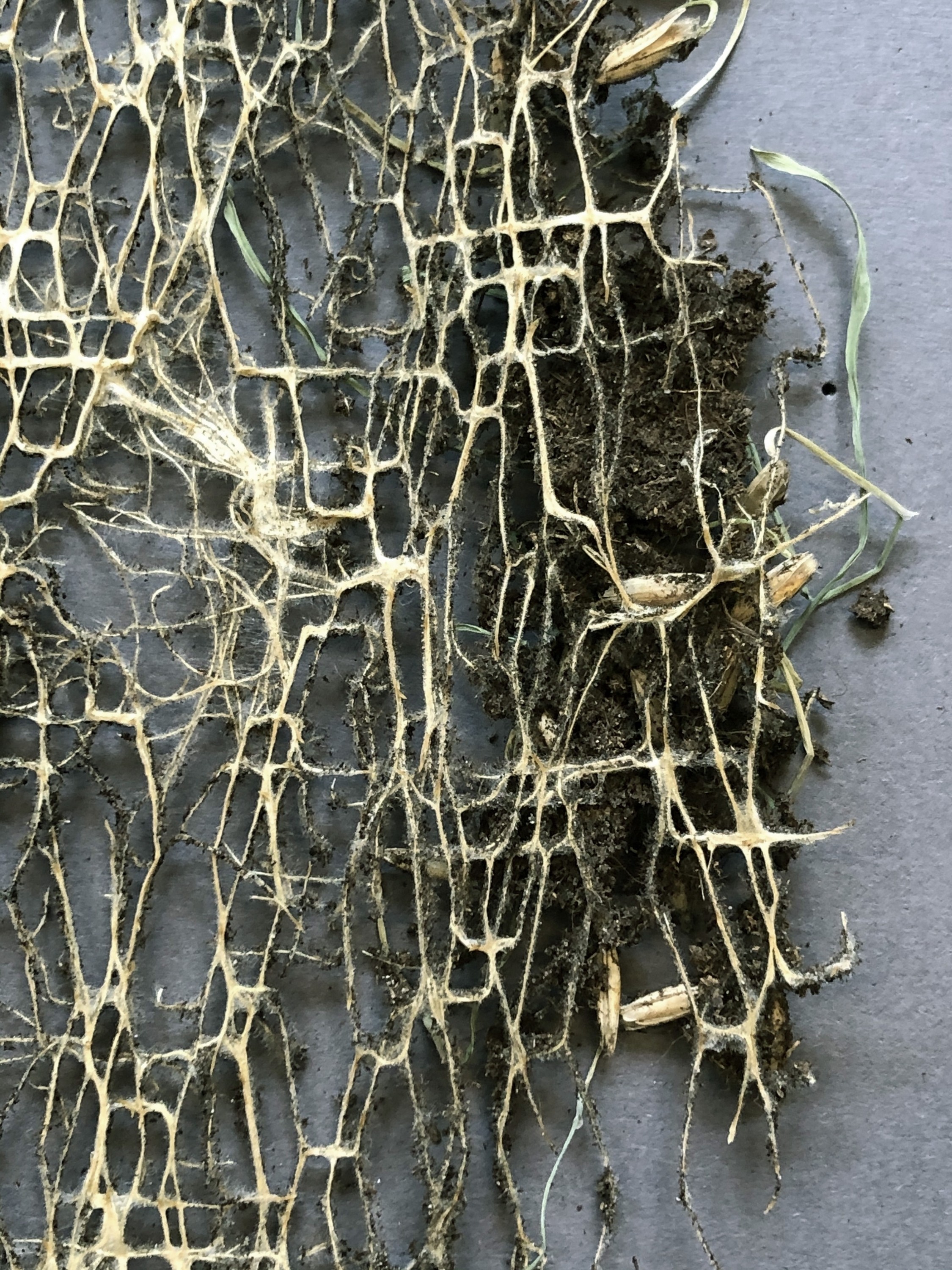 Diana Scherer (Lauingen, Duitsland, 1972) werkt met wortelstelsels van planten. Haar atelier is een kunstmatige biotoop, waar vele tinten bladgroen oplichten.