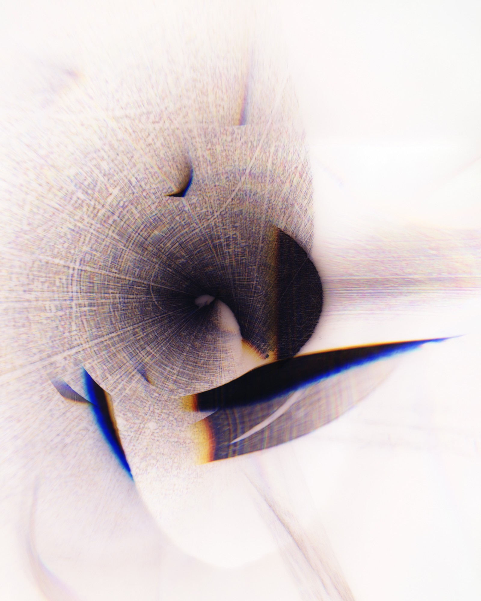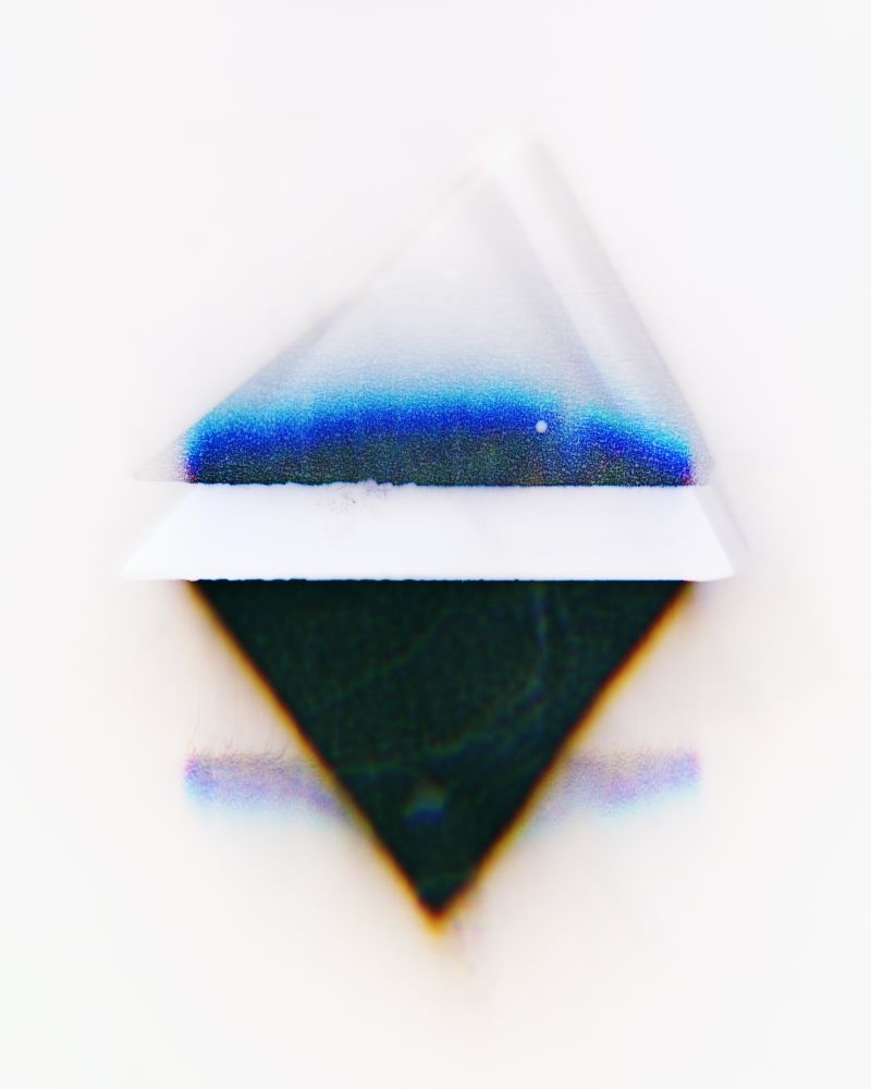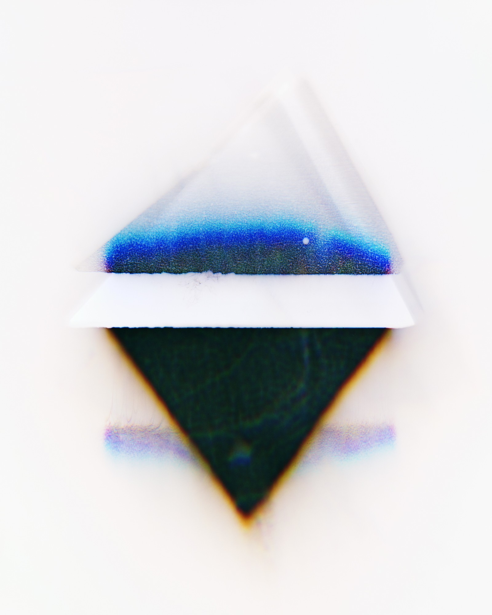 In de serie Exploded Views toont Sjoerd Knibbeler de uitkomst van een expeditie die voortkwam uit de vraag: als licht zelf eigenlijk onzichtbaar is en alleen het breken van het zonlicht de wereld zichtbaar maakt en kleuren doet ontstaan, wat zouden er dan voor beelden ontstaan als ik met dat breken van licht experimenteer zònder dat er een wereld is die zichtbaar gemaakt wordt? Dat klinkt wetenschappelijk en filosofisch tegelijk, maar voor Sjoerd is zo’n vraag vooral een praktische kwestie. Hij bouwde een houten kast waar door middel van spiegels en lenzen zonlicht naar binnen wordt gebracht. In die donkere kamer, soms op drie verschillende hoogtes, hing hij glazen prisma’s in extreem uiteenlopende vormen. Driehoeken, afgeplatte bollen, complexe golf- en schelpvormen. Op de bodem van de kast lag lichtgevoelige film, die het spektakel van het gebroken licht kon vastleggen. Via een glazen bodem en een spiegel had hij zicht op de uitkomsten van zijn minutieuze verschuivingen en aanpassingen.