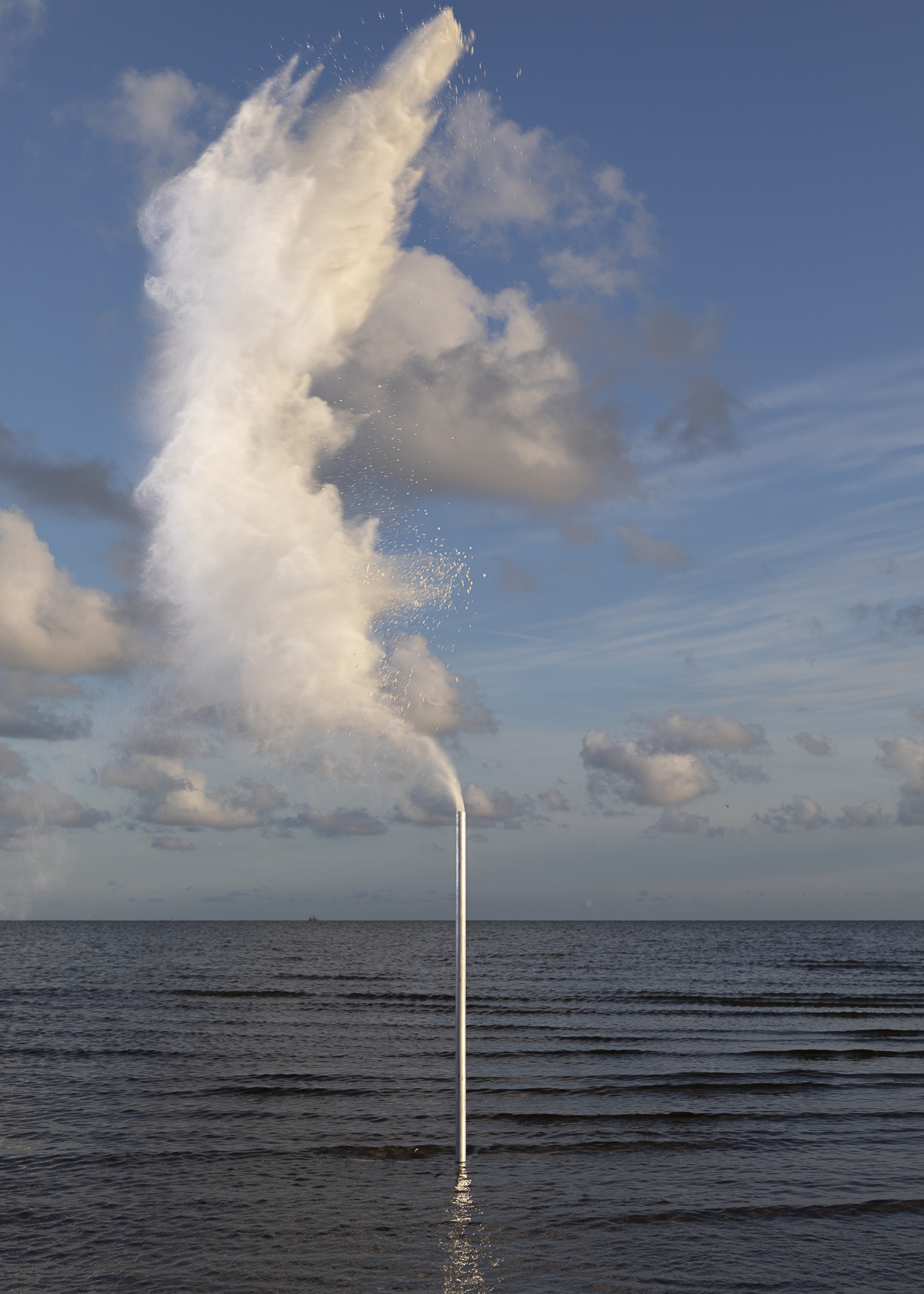 De serie In Elements bestaat uit foto’s gemaakt op het wad bij het Duitse eiland Föhr. Daar zijn alleen de elementen: de hemel met zon en wolken, regen en wind; de zee en het tierende leven in de drooggevallen zeebodem, soms een glimp van de kust. Sjoerd introduceert in die weidse natuurlijke omgeving twee dingen: een verticale stalen buis die een wolk kalkdeeltjes uitstoot en zijn camera die in een bepaalde richting, bij een bepaalde windrichting en op een bepaald moment van het etmaal vastlegt wat er tijdens die kalkexplosie gebeurt. Deze kleine set van variabele ingrediënten levert een verbluffende visuele rijkdom op.