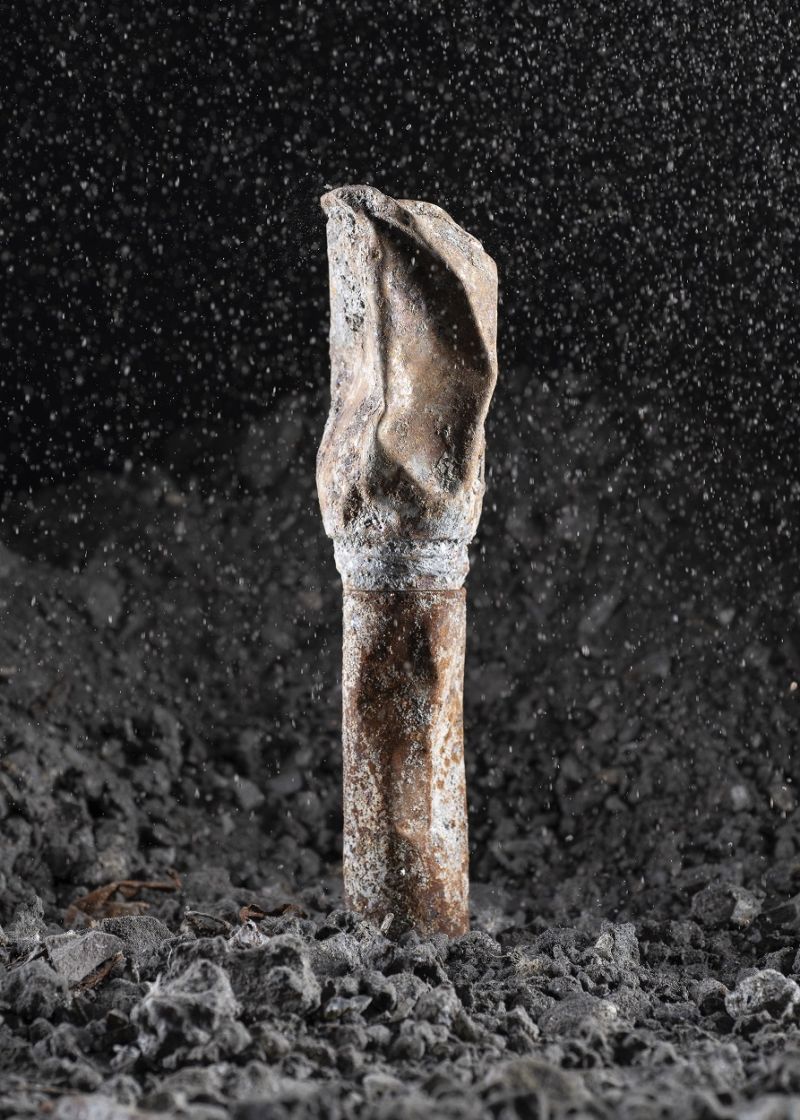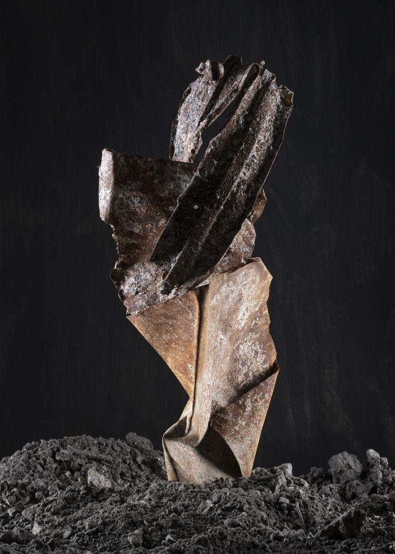 Zijn voorliefde voor het maken van constructies is duidelijk terug te zien in deze serie. Net zoals een wetenschapper in een lab alle externe factoren uitschakelt, werkt Knibbeler graag in de gecontroleerde omgeving van zijn studio. “De volledige beheersing van het licht maakt dat ik bepaalde kwaliteiten van het materiaal kan laten zien. Hier vind ik ook de concentratie die ik nodig heb om datgene te vinden waar het precies om gaat.” In dit geval had het behoorlijk wat voeten in de aarde om het materiaal naar zijn studio te krijgen. Omdat het vervuild materiaal is, geldt er een limiet voor de hoeveelheden die je zonder vergunning mag vervoeren en moest het ook weer terug naar de fabriek. Zo reed de fotograaf dus twee keer heen en weer naar het puntje van Groningen met een paar afgesloten tonnen afval in zijn busje. “Terplekke heb ik opnieuw door de afvalbergen gestruind om die dingen te verzamelen die me iets deden. Dit is een puur intuïtief proces. "Ineens vormde het afval de ingrediënten voor sculpturen die zorgvuldig door Knibbeler werden samengesteld op een met houtskool zwart gemaakte en met zwarte grit bestrooide tabletop tafel. “Dit is voor mij het mooiste gedeelte in het proces. Kijken hoe de materialen bij elkaar passen en wanneer er interessante vormen ontstaan. Het is een continu proces van stapelen, kijken en uitlichten. Het licht brengt het geheel tot leven. Daarna is het de kunst dat de assemblages zo lang blijven staan dat ik ze kan fotograferen. Dit is het magische moment waarin het ineens verandert van een afval object in een sculptuur dat schoonheid in zich heeft.”
