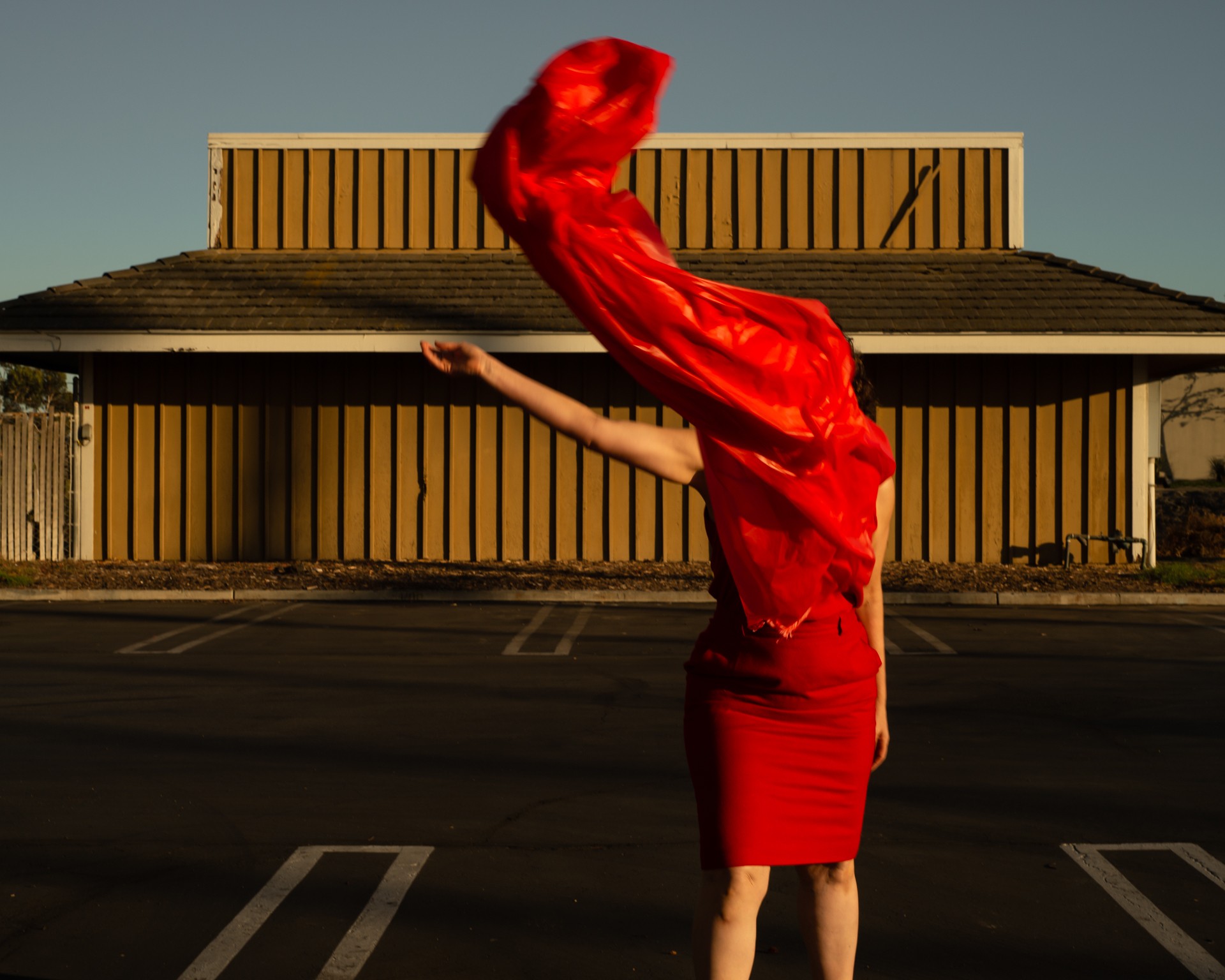 Dankzij die dubbele achtergrond en focus, die zichtbaar wordt in de ruimtelijke presentatie van haar fotomateriaal, beland je bij haar in een filmische setting, dichtbij de hoofdrolspeelster zelf. Dat is haar eigen, beeldschone alter ego. Met pruiken, rode lippen en ravissante brilmonturen doemt Tania Franco Klein op als filmster uit Hollywood. Ze poseert, of liever gezegd: hangt rond, in desolate, uitgestrekte landschappen, langs snelwegen en vliegvelden, in zwembaden en motelkamerinterieurs. Altijd onderweg, nergens thuis. Het is alsof ze wordt voortgedreven door de schone schijn; door de bedrieglijke verleidingen en het verlies van de Amerikaanse droom.
