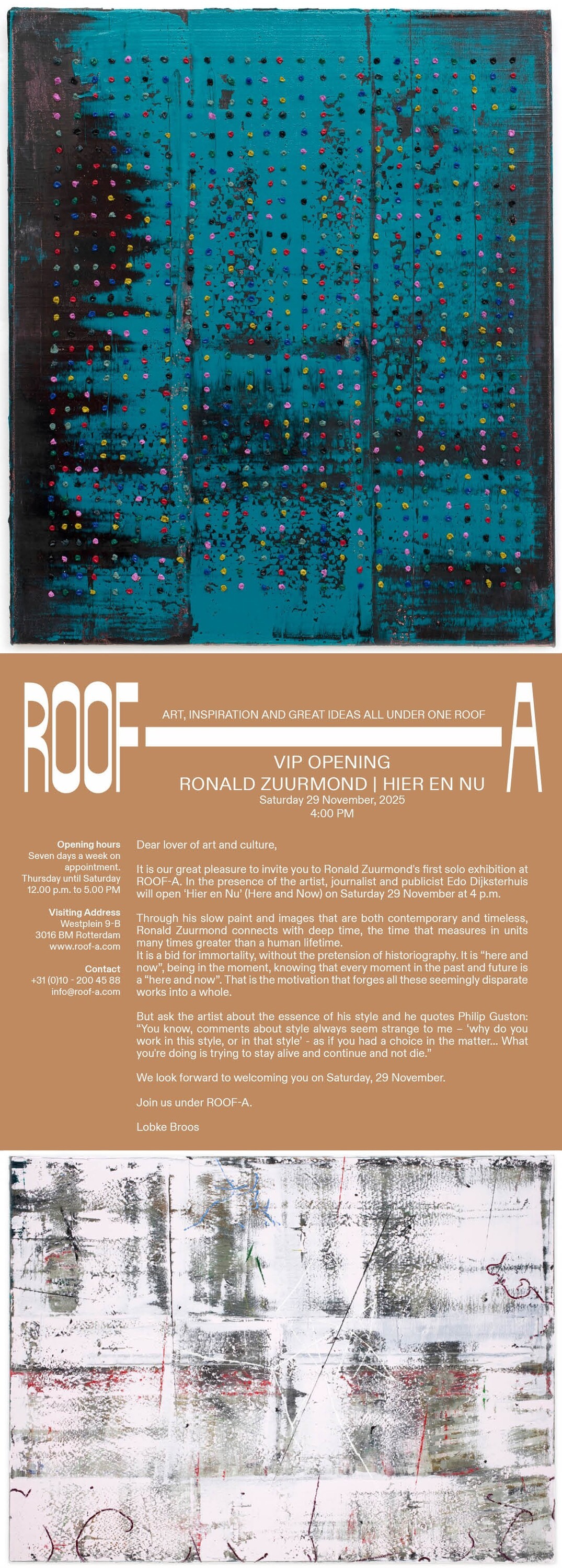 Het is ons een groot genoegen je uit te nodigen voor de eerste solotentoonstelling van Ronald Zuurmond bij ROOF-A. In aanwezigheid van de kunstenaar opent journalist en publicist Edo Dijksterhuis ‘Hier en Nu’ op zaterdag 29 november om 16.00 uur