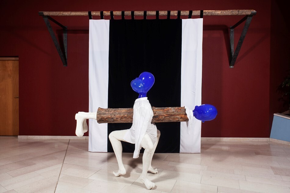 Behalve mannelijke en vrouwelijke figuren die een roes van gevoelens en gedachten oproepen, vloeien bij Assmann voorwerpen en dieren in elkaar over. Messen en vorken dansen samen; uit een hooggehakte schoen verheft zich een vogel. Deze stapelingen hebben een samengebalde poëtische kracht: intrigerend als flessenpost, mysterieus als een relikwie. Middenin de ruimte staat het monumentale beeld ‘Ode aan Mandela’, waarin Assmann alles samenbrengt. Het is een kruising van twee menselijke figuren met hoofden van blauw glas, die elkaars lichaam keihard doorboren (een houten stam gaat als een stormram dwars door een lijf) en elkaar toch ook overeind houden, in een mix van geweld en verzoening, eenheid en dualiteit, heldendom en martelaarschap.