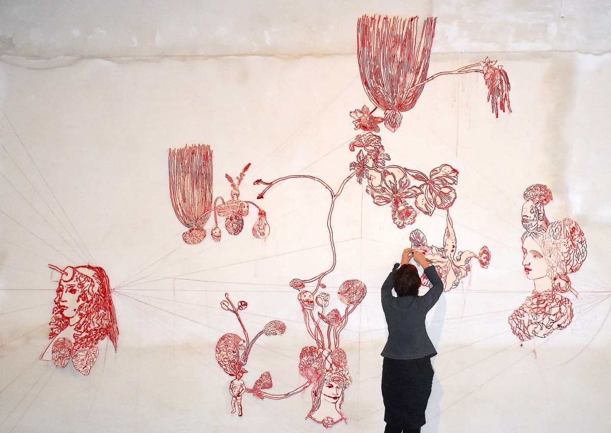 De signatuur van Seet van Hout (Nijmegen, 1957) heeft de elegantie van bloedkoraal. Haar werk bestaat uit schilderijen, sculpturen en installaties, waarin de kleur rood een hoofdrol speelt. Karakteristiek zijn ook de zwierige contouren. Er zijn veel uitwaaierende lijnen en kantachtige patronen, die dit oeuvre tot een hecht weefsel maken, vol vertakkingen en verbindingen. Er gaat letterlijk een rode draad doorheen. De borduurmachine is de rechterhand van deze kunstenaar.
