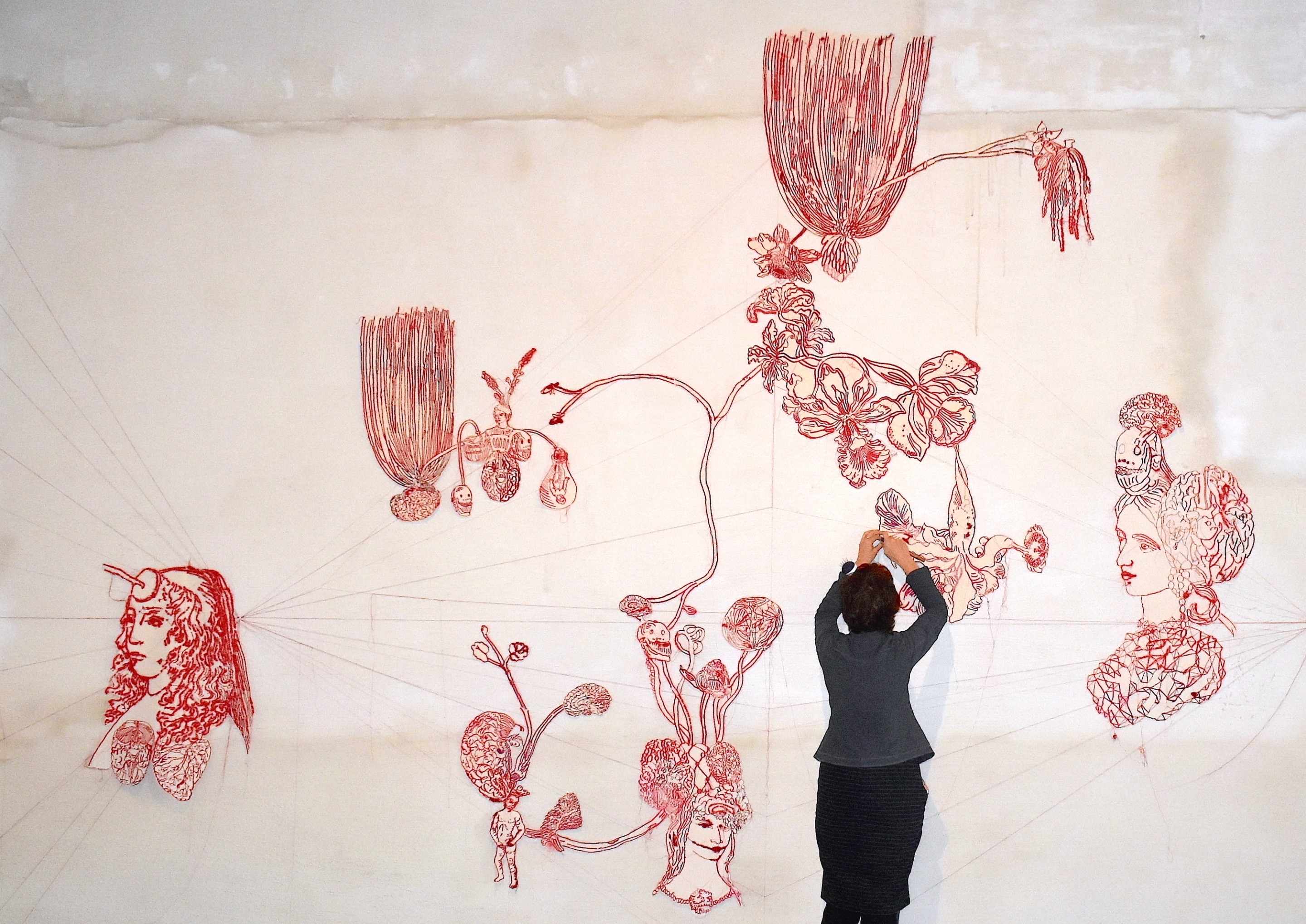 Van Hout zet met haar voortslingerende draad sporen uit. Ze ontvouwt een wonderlijke plattegrond, op doek, papier en in de ruimte, met stroken textiel die over de vloer krullen of aan het plafond hangen. Vloeiende lijnen strekken zich uit als voetpaden in een tuin.